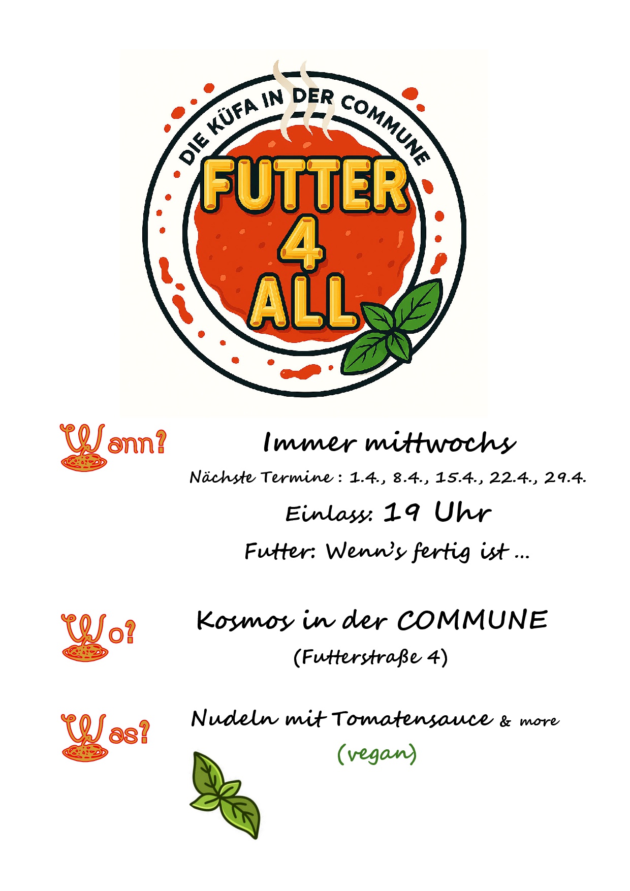 Auch im April heißt euch „Futter 4 all“ willkommen! Mittwochs gibt es im Kosmos einen gemütlichen Pasta-Abend. Ab 19 Uhr sind die Türen geöffnet. Essen gibt’s ab 19:30 Uhr – oder eben wenn’s fertig ist. Kommt vorbei, bringt eure Freund:innen mit und lasst uns gemeinsam essen, reden und genießen! Essen und Getränke auf Spendenbasis.